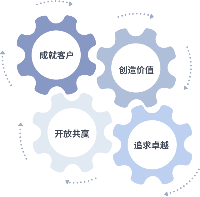 成就客户是一切决策的出发点,,,创造价值是衡量所有工作的标准,,追求卓越是我们做事做人的态度,,,,开放共赢是我们的格局也是最终的结果。。价值观的齿轮环环相扣,,,推动着组织里的每个人不断向前。。。